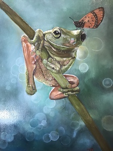 2020Geschilderd met olieverf op paneel een kikker met vlinder